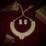 An exquisite diamond-studded choker necklace set featuring intricate craftsmanship in gold tones, adorned with dazzling pear-cut stones and matching earrings a timeless piece for every royal occasion.