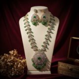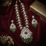 The Divine Emerald Drop Set is a breathtaking piece of heirloom-quality jewelry. This long necklace (haar) features an elaborate chain of floral/leaf motifs intricately set with brilliant Zircon/AD stones and accented with emerald-look stones. A stunning, oversized multi-layered pendant with cascading emerald drops anchors the design. Paired with magnificent matching earrings, this set offers unmatched bridal or grand formal elegance.