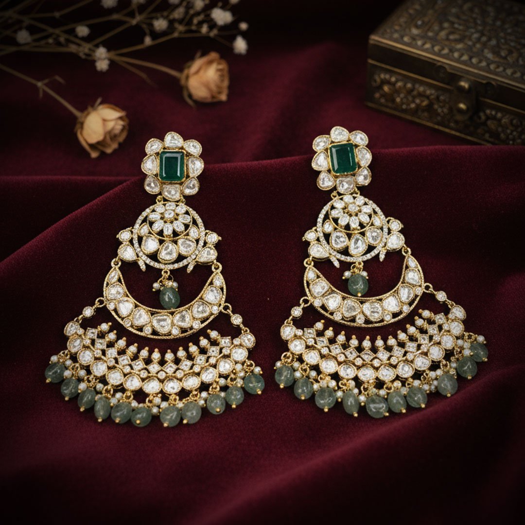 Below the stud, the earring flows into the classic, multi-layered Chandbali (moon) silhouette. Each sweeping crescent is meticulously hand-set with glittering Polki (uncut diamonds), creating a magnificent sparkle and texture that speaks of royal heritage.