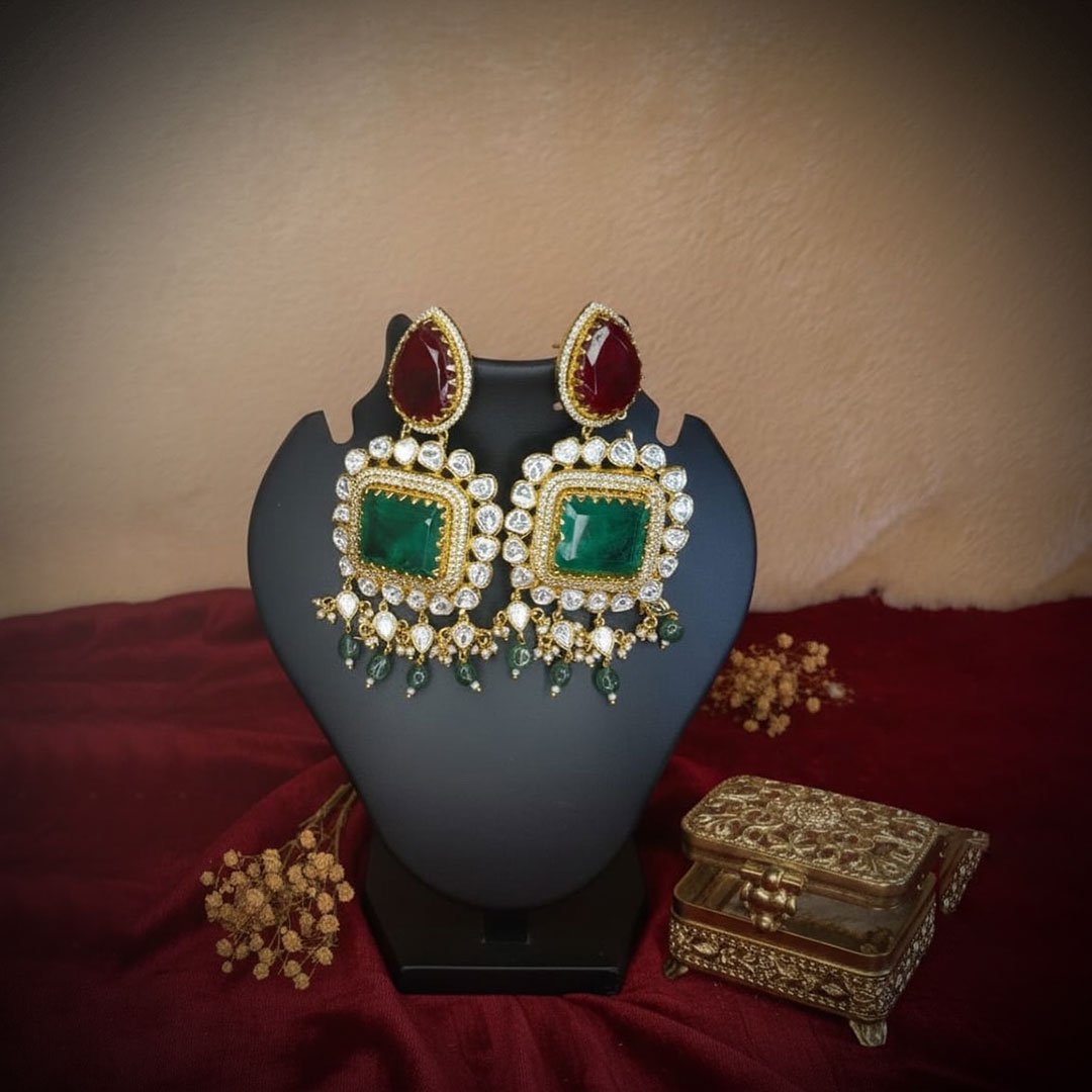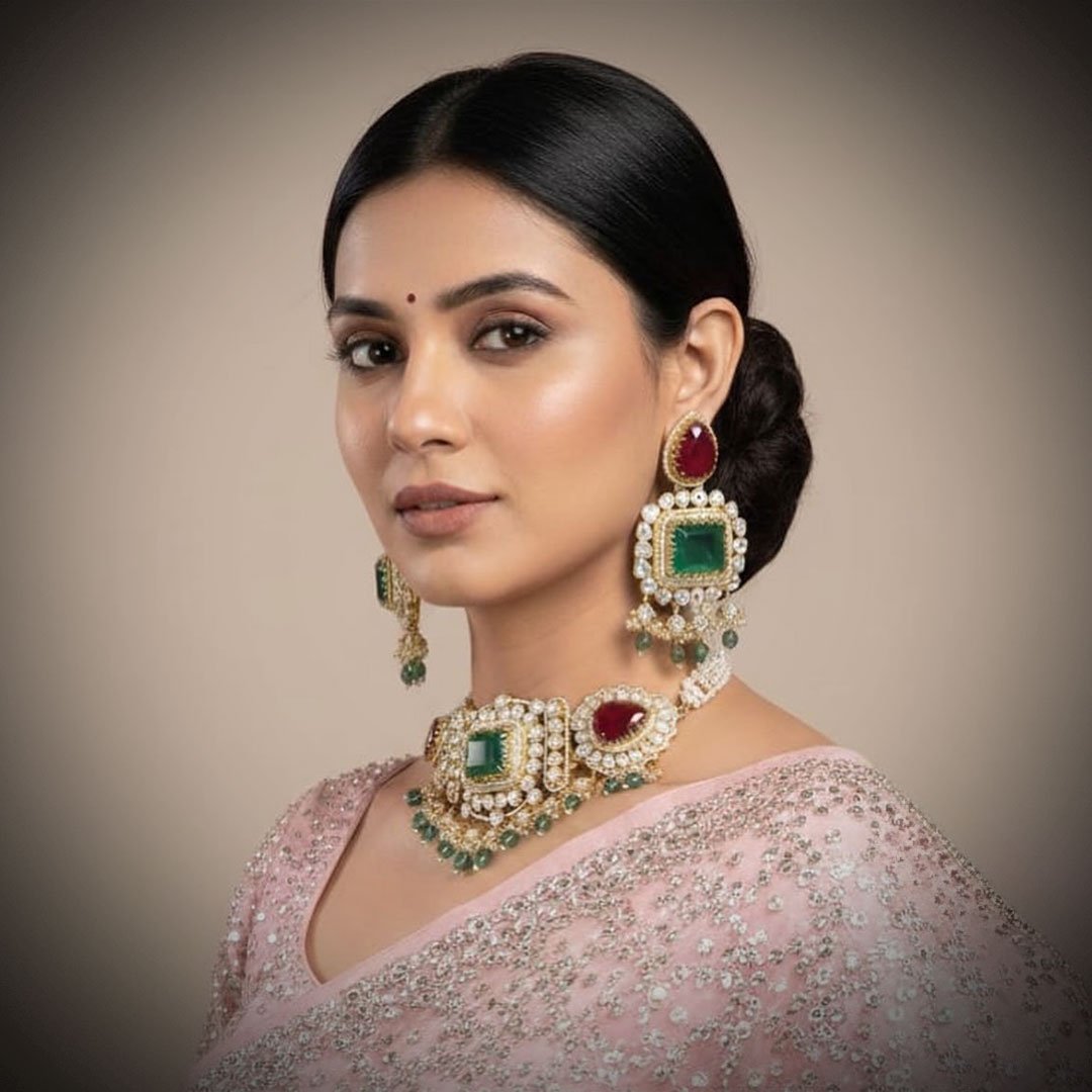 The Emerald Ruby Imperial Choker is a majestic statement piece inspired by Mughal royalty. This broad choker features a central square emerald surrounded by dazzling Kundan/Polki-style stones and flanked by two prominent deep ruby accents. The striking white, green, and red color palette is completed by a delicate fringe of emerald drops and a luxurious multi-strand pearl neckband. A perfect heirloom piece for grand occasions.
