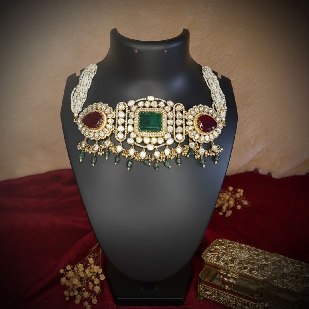 Key Features Design Style:Royal Mughal / Kundan-Polki Metal Finish:Antique gold-tone plating. Central Stones:Prominent rectangular emerald-look stone and two large ruby-look accent stones. Main Embellishments:Dazzling border and setting of uncut-look white stones (Kundan/Polki). Fringe/Dangles:Delicate drops of polished emerald teardrop beads. Neckband:Luxurious, thick multi-strand seed pearl Set Includes:One single, broad Statement Choker Necklace (Earrings are not included in this photo). Occasion:Bridal Wear, Receptions, Grand Festivals, Formal Events.