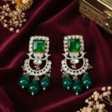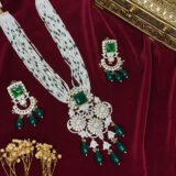 The Emerald Waterfall Pearl Set is a magnificent long necklace collection that exudes dramatic elegance. It features a dazzling multi-strand seed pearl chain interspersed with tiny emerald beads, leading to an elaborate, geometric pendant lavishly set with brilliant Zircon/AD stones. The dramatic fringe of large emerald drops creates the signature “waterfall” effect. Paired with ornate matching earrings, this set is ideal for a truly grand and luxurious affair.