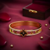 The Fashion Square Bracelet is a striking, contemporary hinged bangle that makes a bold statement. Crafted in a polished gold-tone finish, the band features a unique, repeating designer-inspired ‘LV’ monogram pattern against a transparent background, brilliantly bordered by lines of sparkling pave-set crystals. The centerpiece is a contrasting black square motif set with a decorative gold pattern. It’s the perfect chic accessory for a modern, high-fashion look.