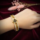 The focal point is the bold, centrally placed square motif with a unique black enamel or resin inlay. This central square is accented with a delicate gold pattern and stands out dramatically against the surrounding gold and crystal work. The hinged design ensures easy wearability and a comfortable, secure fit. This bracelet is an excellent choice for adding a touch of sophisticated, contemporary glamour to evening wear or elevating your casual attire.