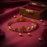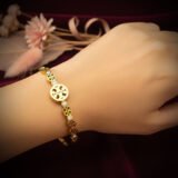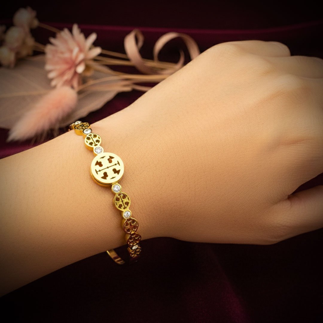The Golden Motif Bracelet is a delicate yet sophisticated hinged bangle that exudes understated luxury. Crafted in a polished gold-tone finish, the slim band is accented by a chain of round, open-work motifs set with sparkling crystals. The centerpiece is a prominent round medallion featuring a stylized, designer-inspired emblem, making this piece perfect for everyday elegance or stylish stacking.