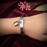 The Heritage Key Bracelet is a sleek, edgy hinged bangle that features a modern, structured design with a distinctive lock and key element. Crafted in a polished silver-tone finish, the band features a unique dark wood-grain or tortoise-shell style inlay and is accented by a small, dangling padlock charm. This piece is the perfect accessory for adding a touch of contemporary luxury and subtle designer flair.