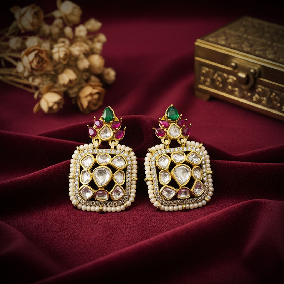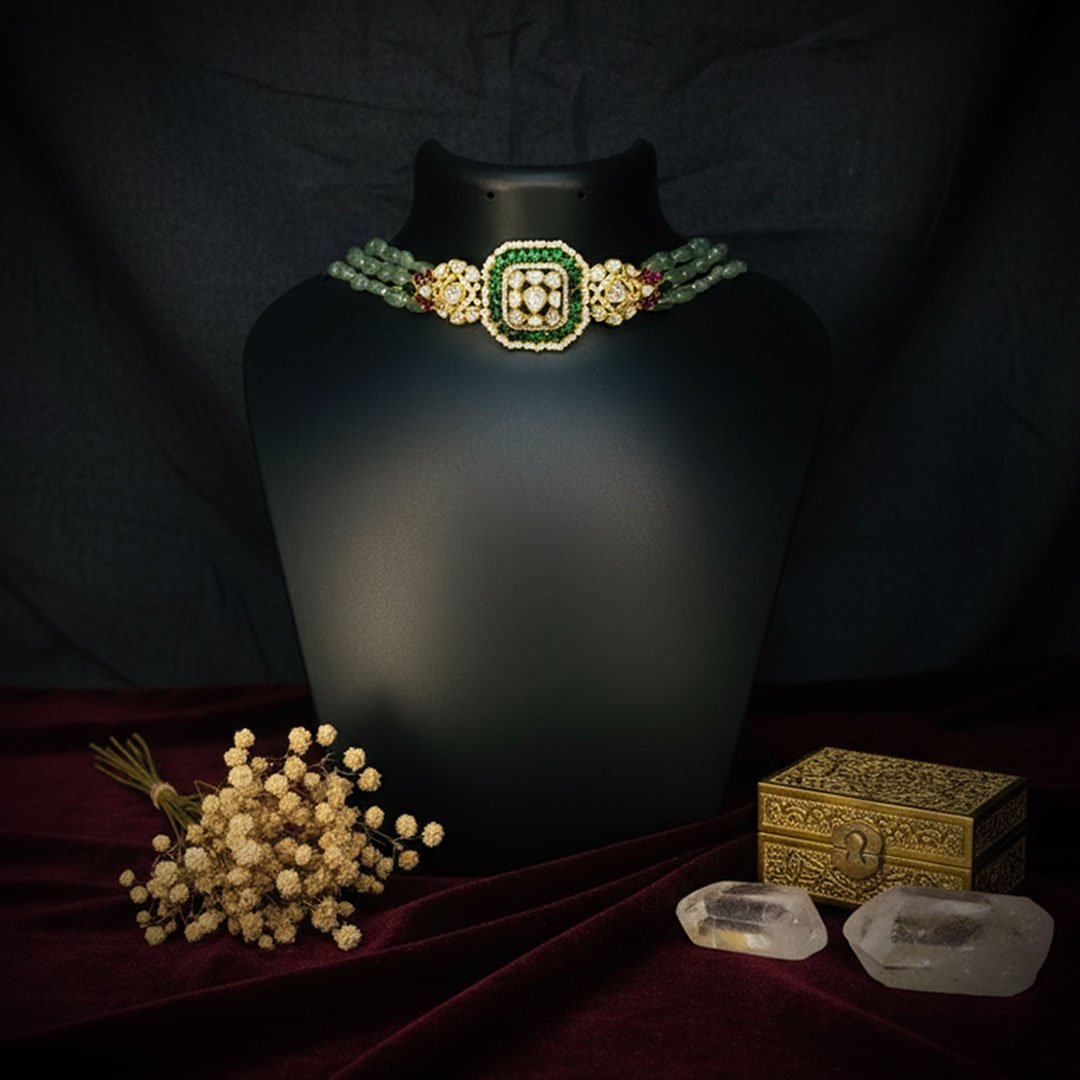 The focal point is the elaborate central motif: a geometric square design surrounded by bright green stones and tiny seed pearls. Inside, brilliant uncut-look white stones (Kundan/Polki style) are meticulously set to create an undeniable sparkle. This central motif is flanked by two smaller, equally detailed floral/petal designs, accented with hints of deep ruby-red stones. The choker is secured with a traditional adjustable dori (cord) for a comfortable and customized fit. This is the perfect accessory for adding a touch of sophisticated color to any festive, mehendi, or wedding attire.