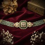 Adorn yourself with the striking Heritage Mint & Kundan Choker, a piece that beautifully balances traditional regal work with a refreshing, modern color palette. The necklace features a lush, four-strand band of smooth, polished mint-green beads, which offers a softer, more subtle alternative to traditional deep emeralds.