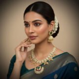 The Moonlight Blossom Necklace is a spectacular piece inspired by ancient royal jewelry. This statement necklace features a continuous band of brilliant Kundan/Polki-style white stones accented by delicate pearls and geometric moon motifs. A breathtaking central pendant showcases rich ruby and emerald stones. Perfect for a grand, luxurious look at weddings, receptions, or any formal evening gala.