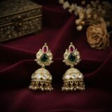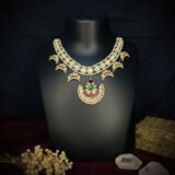 The true showstopper is the large, detachable-style central pendant, which mirrors the crescent shape. It is richly adorned with the white Kundan stones and prominently features a combination of deep ruby and vibrant emerald cabochons, adding a vital pop of royal color. This necklace sits beautifully along the collarbone, offering a heavy, opulent aesthetic that ensures you make a spectacular entrance at any major event.