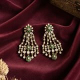 Accented with rich green enamel highlights, the design beautifully balances classic white stones with deep green tones, evoking a timeless regal charm. The structured yet fluid drop pattern adds grandeur without feeling heavy, making these earrings perfect for weddings, festive occasions, and celebratory evenings.