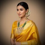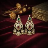 The necklace is supported by a comfortable multi-strand pearl neckband and an adjustable traditional gold cord (dori). The set is completed by a pair of perfectly matched chandelier drop earrings, which mirror the pendant’s Kundan/Polki work, ruby/emerald accents, and charming pearl drops. This set is a definitive choice for grand functions, offering a timeless, colorful, and truly regal aesthetic.