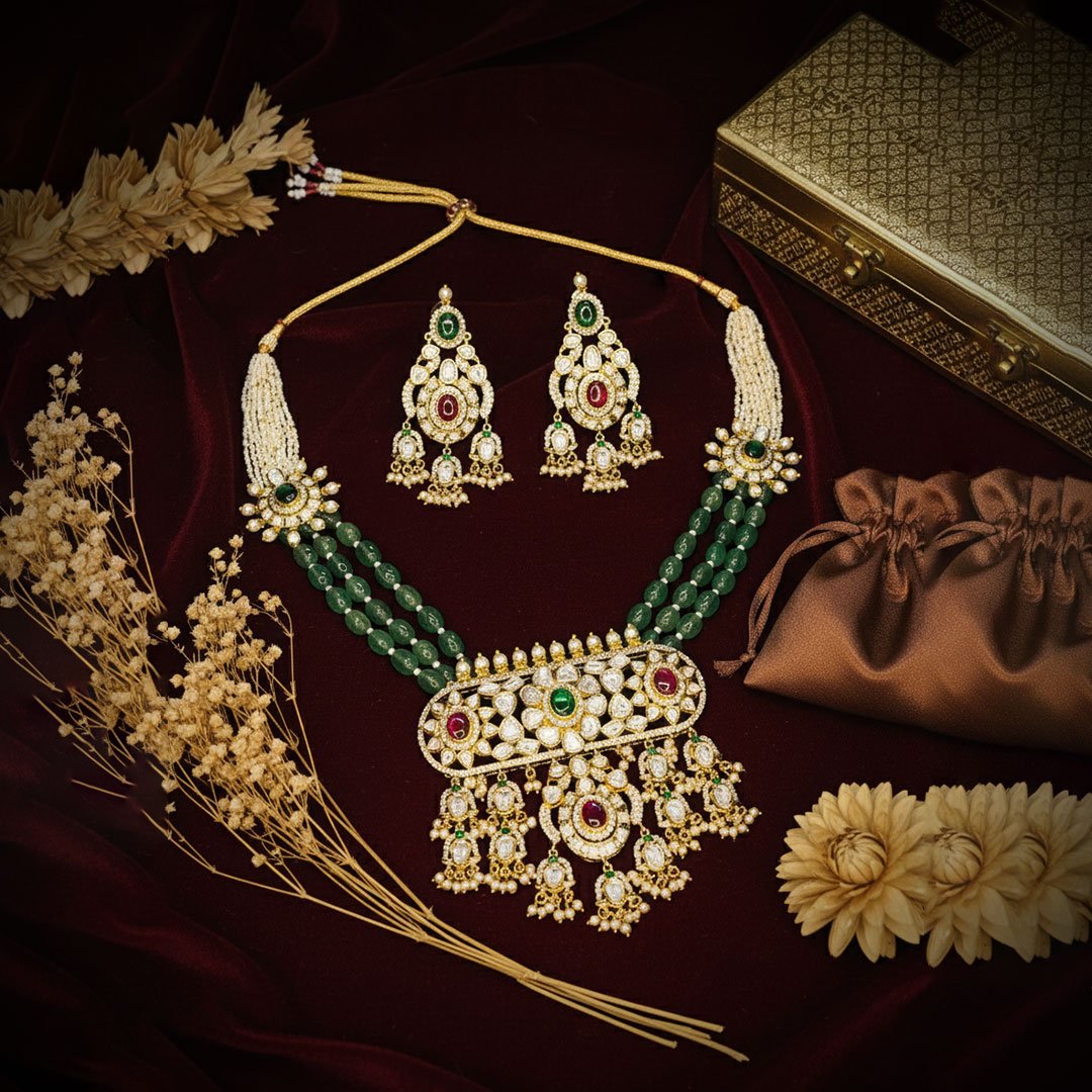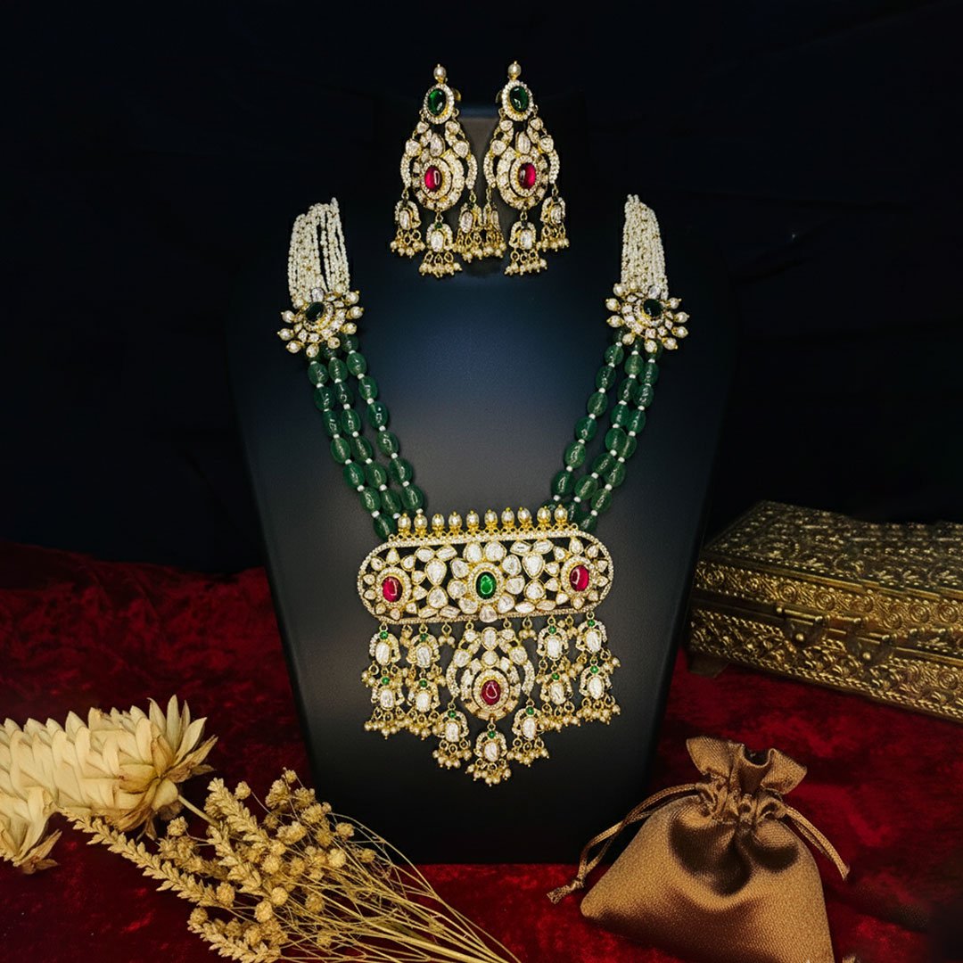 The Regal Ruby & Emerald Set is a stunning statement collection that epitomizes classic Indian luxury. The necklace features three strands of rich green emerald-look beads leading to a lavish Kundan/Polki pendant, beautifully accented with deep ruby and emerald stones. Paired with elegant matching drop earrings, this set is perfect for making a sophisticated and colorful impact at any wedding or grand festive occasion.