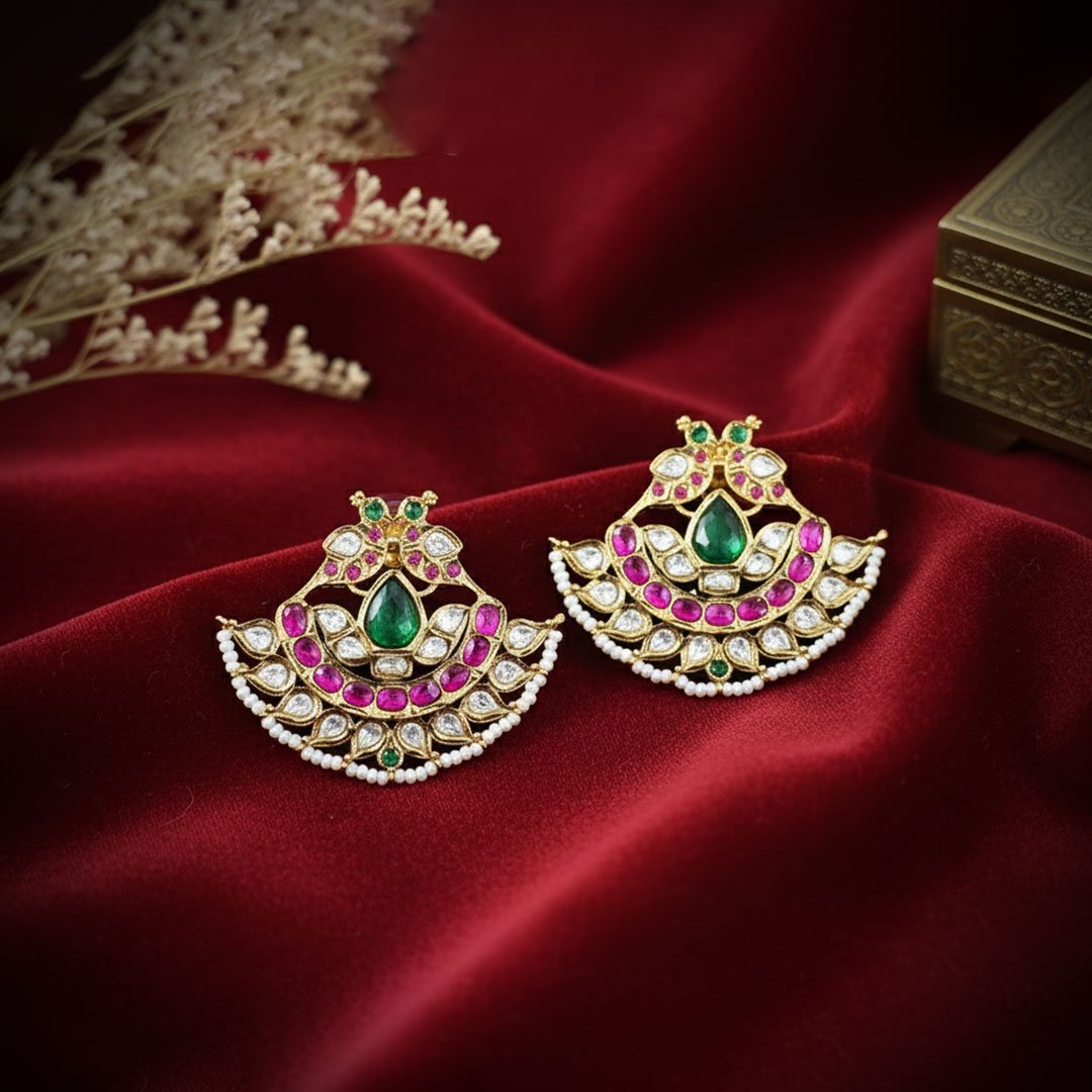 Exquisite fan-shaped Kundan-style earrings featuring a vivid palette of ruby and emerald colored stones, accented by pearls and white sparkle. A regal, statement drop earring perfect for festive grandeur.