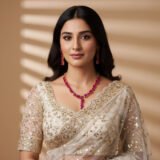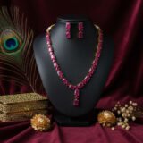 Set against a backdrop of deep red hues, the design draws inspiration from vintage Indian craftsmanship—making it ideal for weddings, festive occasions, and traditional celebrations. Whether worn with a saree, lehenga, or an Indo-western outfit, the Ruby Radiance Set promises unmatched charm and brilliance.