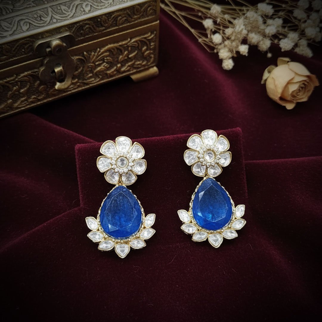 Elegant floral drops featuring a brilliant, faceted sapphire-blue teardrop stone surrounded by a delicate petal halo, suspended from a stunning Kundan-inspired flower stud.