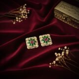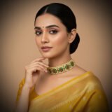The Festive Flora Choker is a stunning piece of jewelry that captures the joy of celebration. This broad choker features an intricate, continuous band of floral motifs defined by bright emerald-green and deep ruby-red stones. The entire piece is brilliantly framed by sparkling white Kundan/Polki-style stones and a delicate pearl border, offering a rich, colorful, and traditional look perfect for any grand festive occasion.