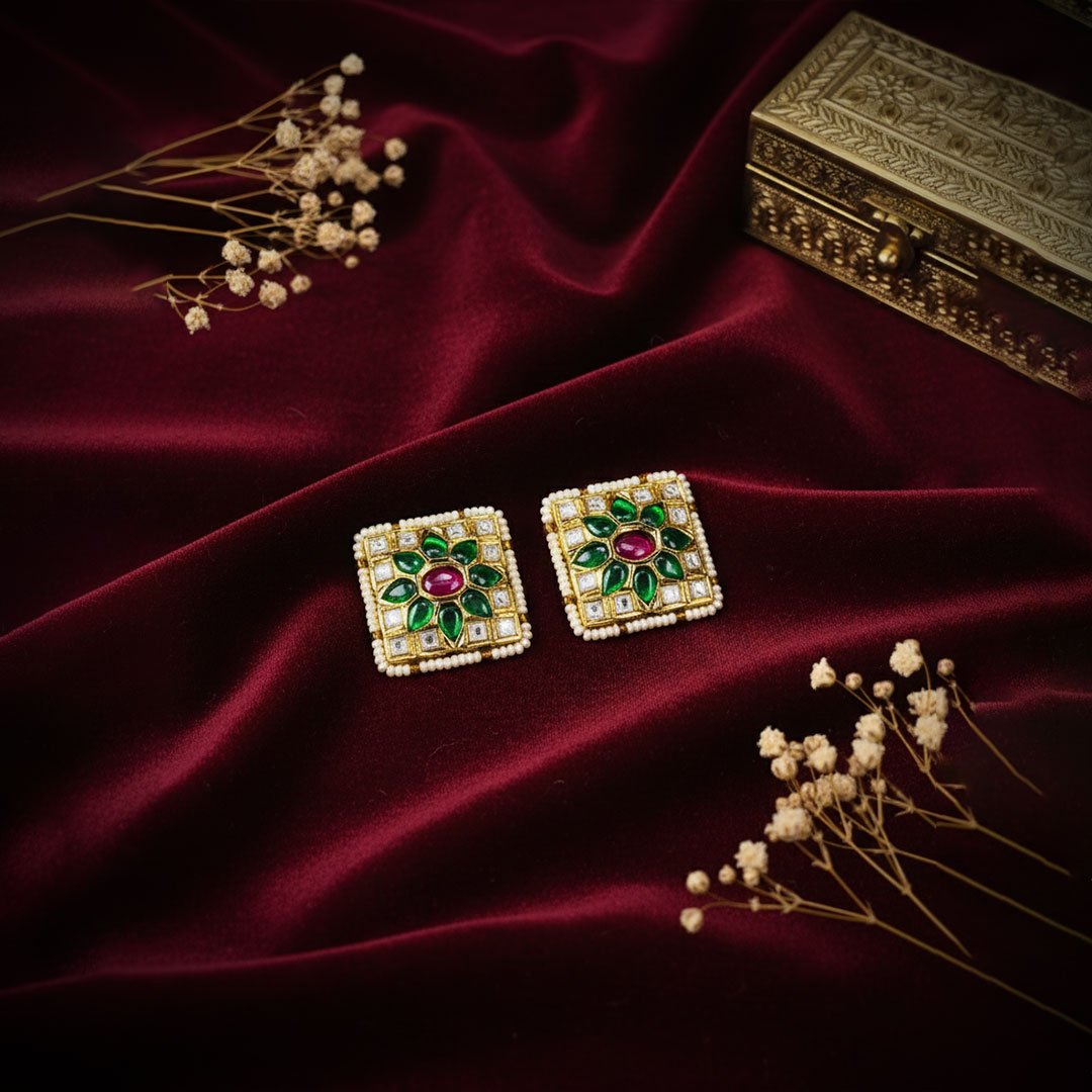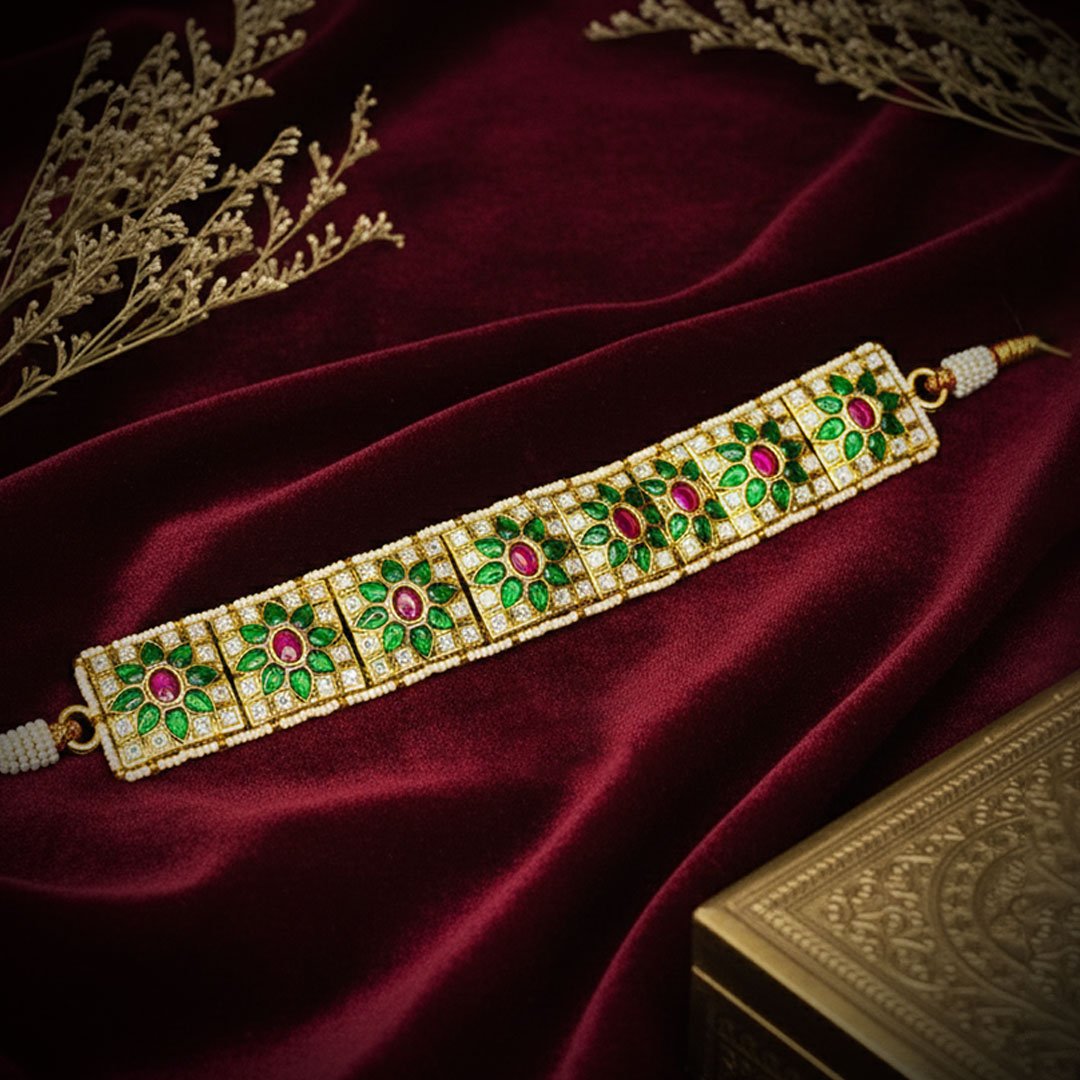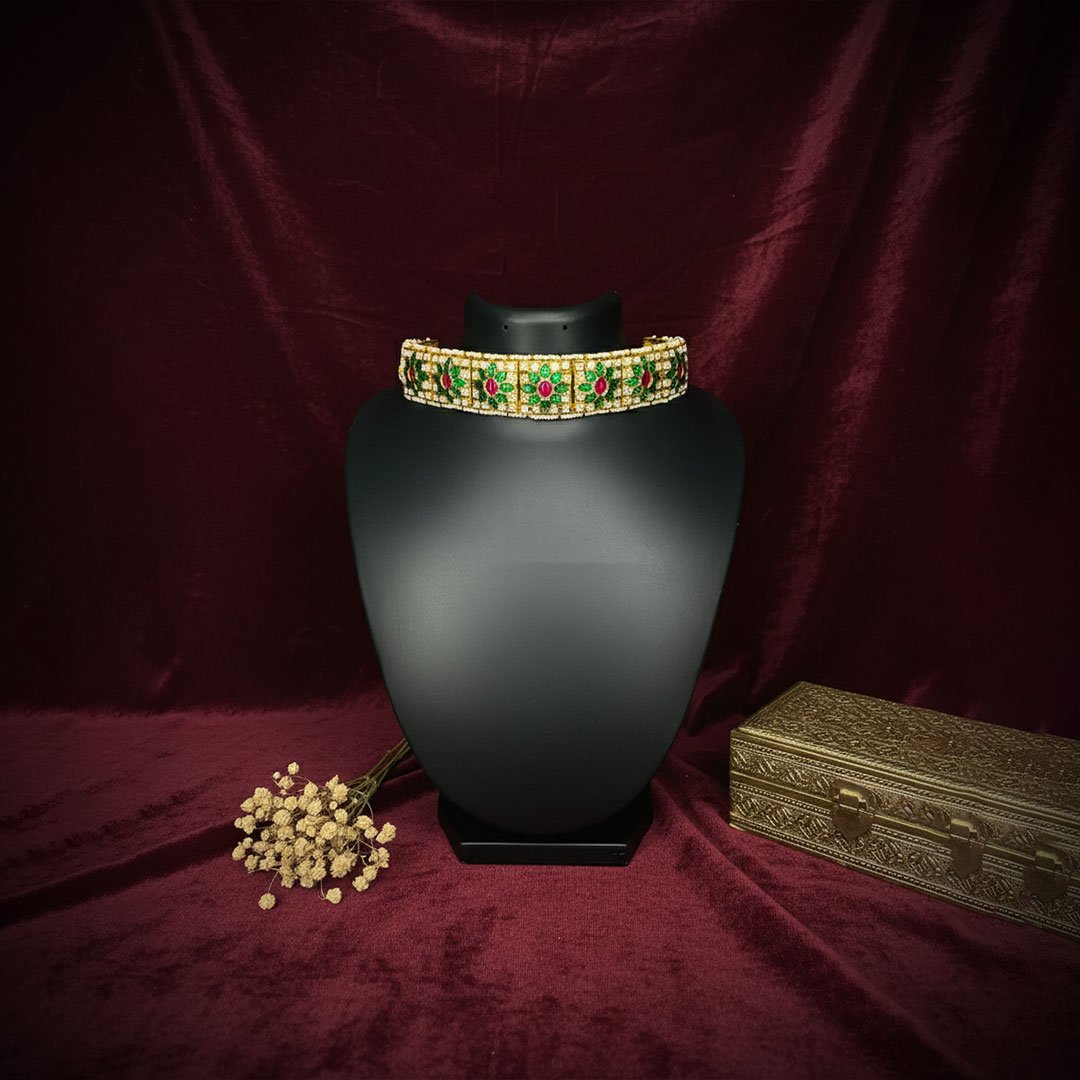 Elevate your traditional ensemble with the exquisite The Festive Flora Choker. This statement piece is characterized by its bold, broad band design, showcasing a continuous line of intricate Kundan/Polki-style floral motifs. Each small flower is brought to life with vibrant color, featuring a combination of rich emerald-green petals and a central accent of ruby-red stones.